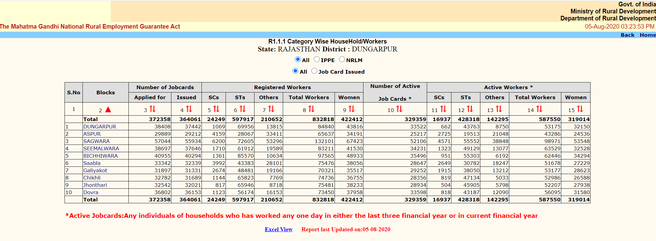 A total of 832,818 people are registered under MGNREGS in Dungarpur, of which 587,550 are active workers. The district has 364,061 households with MGNREGS job cards, a work entitlement document. Of these, 329,359 are active, implying that at least one individual of the household has opted for MGNREGS work for at least one day in either the last three financial years or in the current financial year.